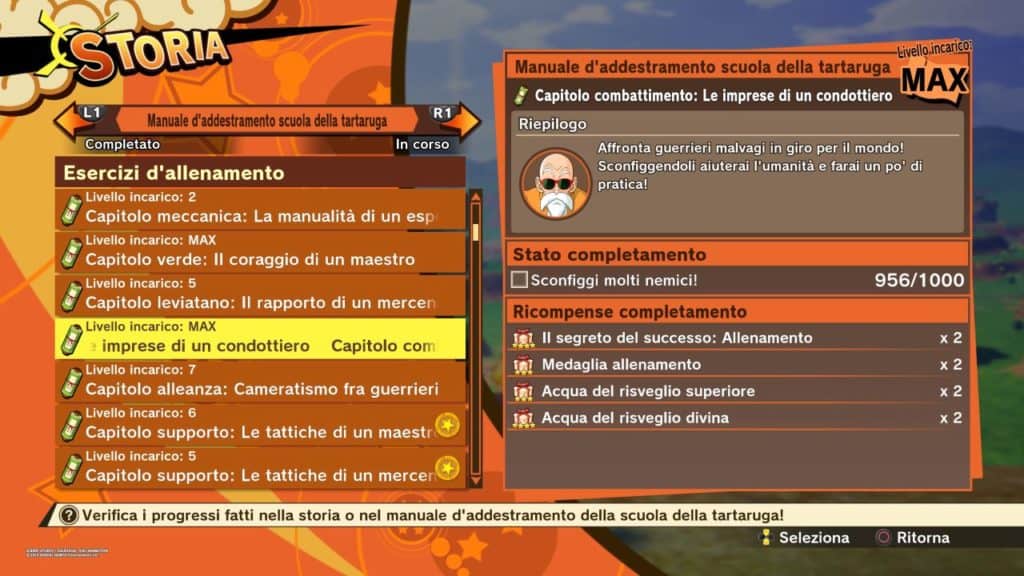 Le sfide del Maestro Muten in DRAGON BALL Z: KAKAROT sono degli incarichi speciali, facilmente completabili, che saranno disponibili sin dalle primissime fasi di gioco. Queste particolari sfide, per essere completate, vi richiederanno di effettuare diverse azioni (raccogli un certo numero di sfere Z, sconfiggi un determinato numero di nemici, gioca per un totale di ore reali, ecc). Dal momento che esistono molte più sfide delle 50 richieste dal trofeo, il consiglio è quello di non pensarci troppo perché, quasi sicuramente, otterrete questo trofeo senza neanche volerlo. L’unica, importantissima, informazione in merito a queste sfide riguarda il loro completamento. Per essere considerate come “superate” dovrete, di tanto in tanto, tornare alla Kame House e parlare con il maestro Muten per ottenere anche delle interessanti ricompense. Tenete a mente, infine, che potrete tenere traccia delle sfide e dei loro progressi in qualsiasi momento semplicemente aprendo il menu principale, andando nella sezione “storia” e cambiando categoria con |