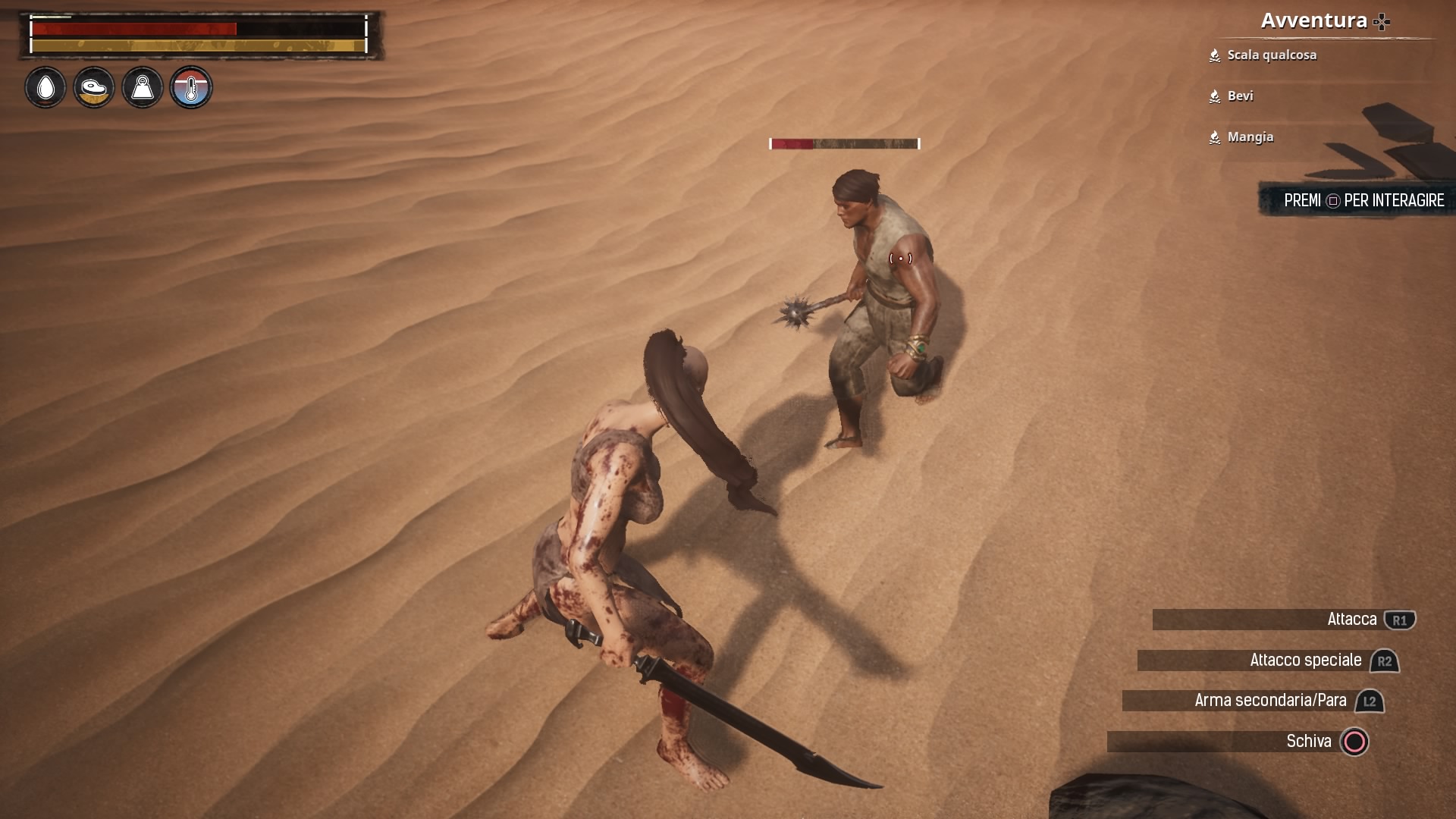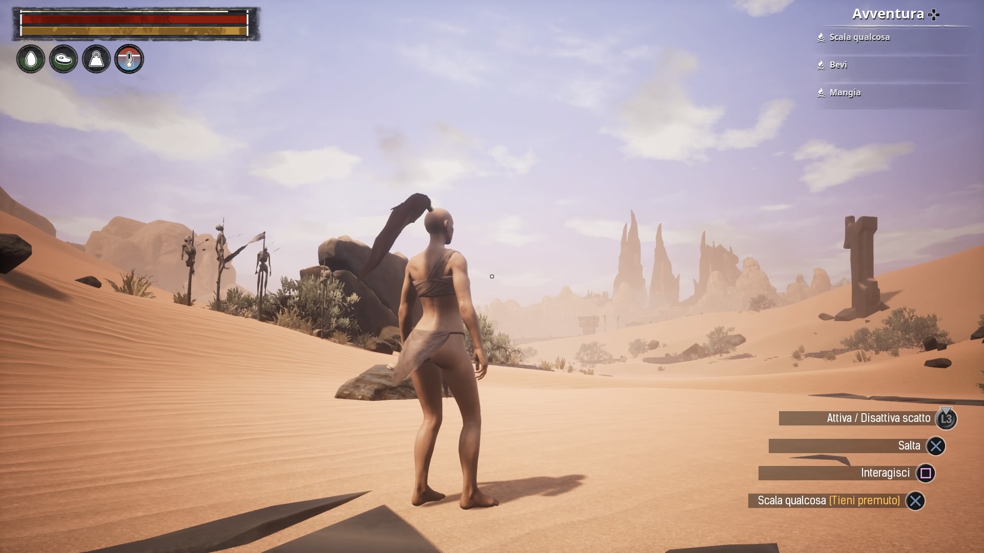 Il gameplay di Conan Exiles si presenta a tutti gli effetti come un survival game open world in cui, come già detto prima, il nostro scopo è quello di sopravvivere e per far questo dobbiamo tener conto anche ad alcuni fattori. Gestire la fame e la sete del nostro personaggio è ad esempio uno dei nostri compiti per evitare la morte; dobbiamo saper gestire il peso che portiamo e la gestione dell’inventario è di fondamentale importanza per creare oggetti sempre nuovi per attaccare o difendere.