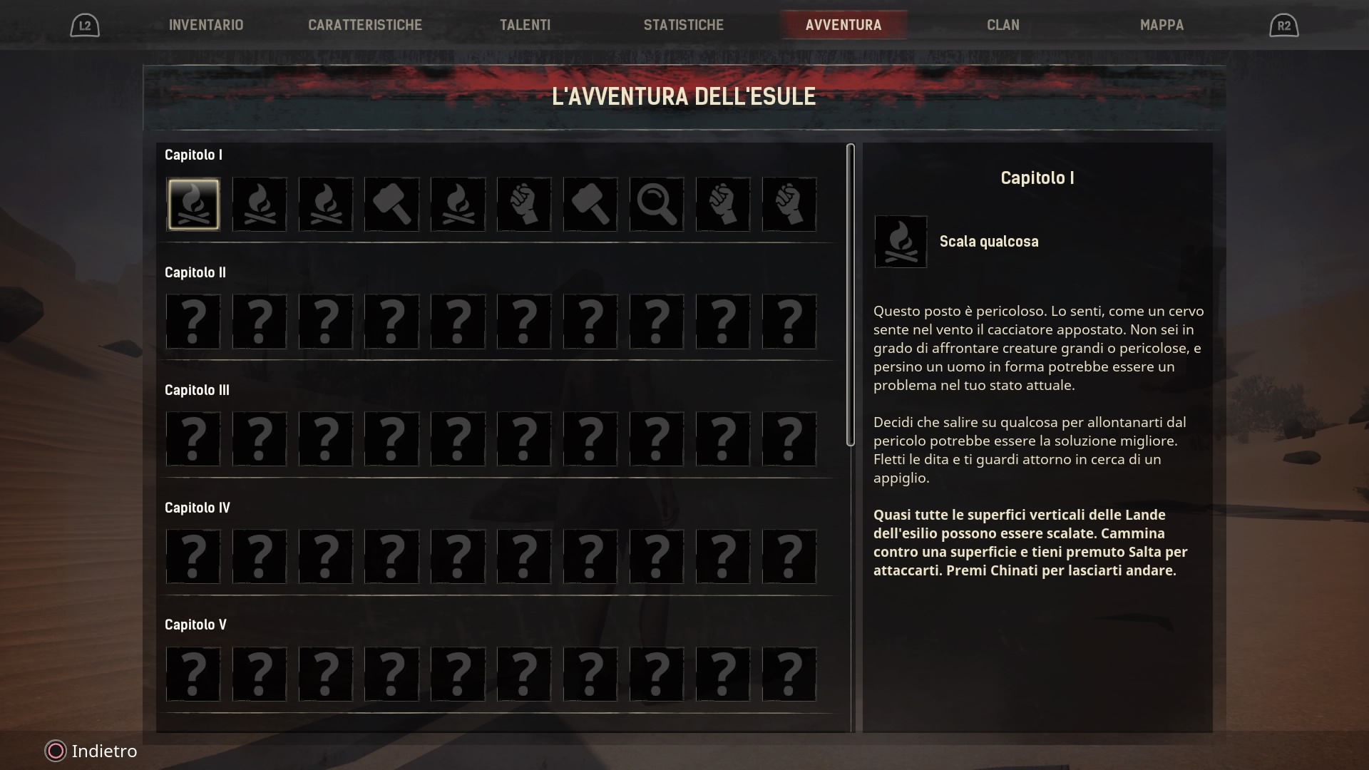 L’unica “trama” che ci porta avanti nell’avventura è composta da piccoli obiettivi che compaiono a schermo, sotto la voce “Avventura”. Durante il primo capitolo, ad esempio, ci viene chiesto di mangiare, bere, scalare qualcosa; insomma dei piccoli step iniziali per prendere familiarità con il gioco.