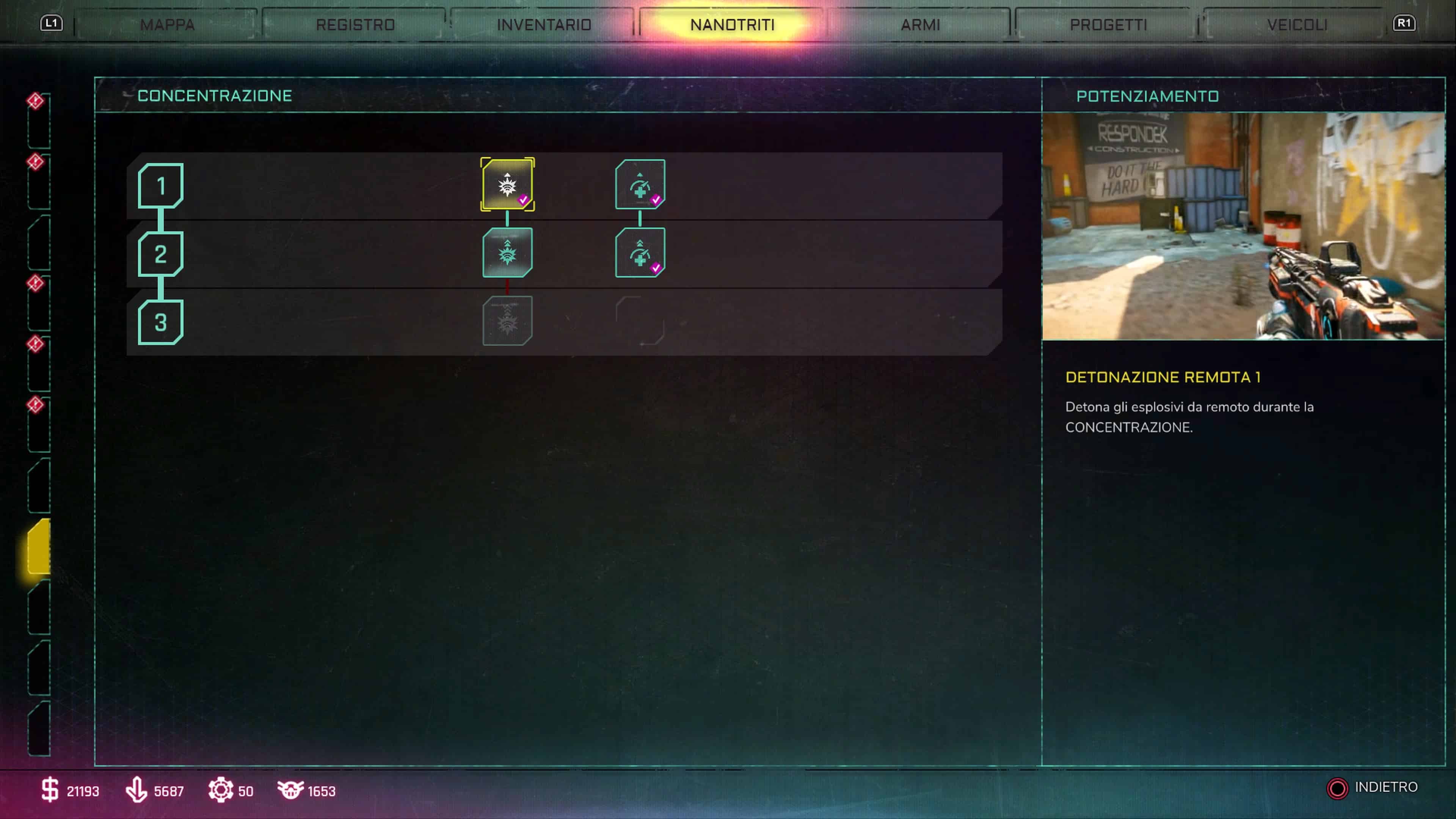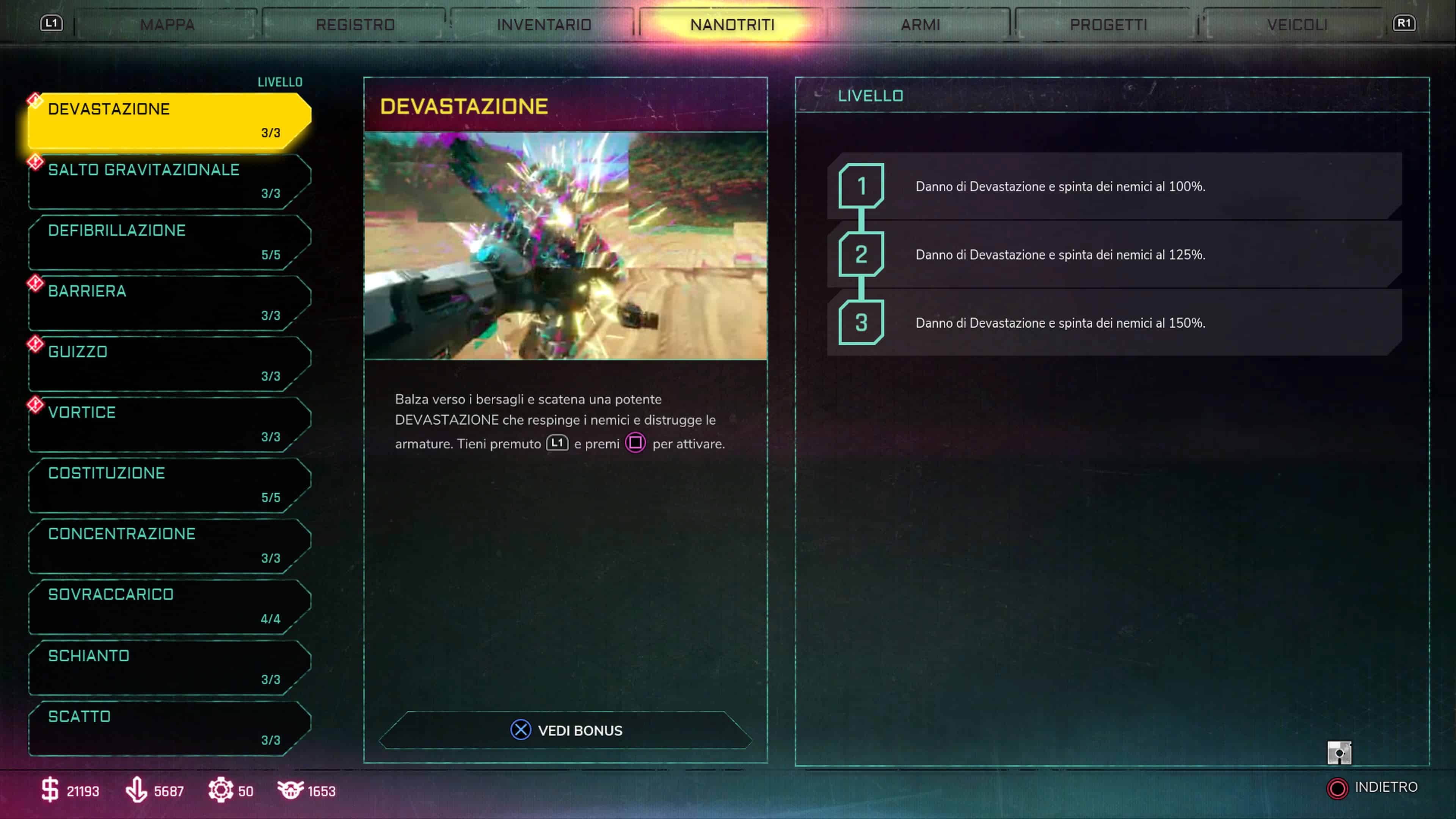 Ogni abilità può essere potenziata più volte grazie alla “feltrite”, materiale principale che troverete sparso all’interno del mondo di gioco. Inoltre, è possibile sbloccare dei “bonus” per ogni abilità. I bonus possono essere comprati grazie ai “Potenziamenti Nanotrici”, questi ultimi si trovano all’interno delle “Casse Arcaiche”, casse speciali che troverete negli accampamenti e nei luoghi di interesse.
