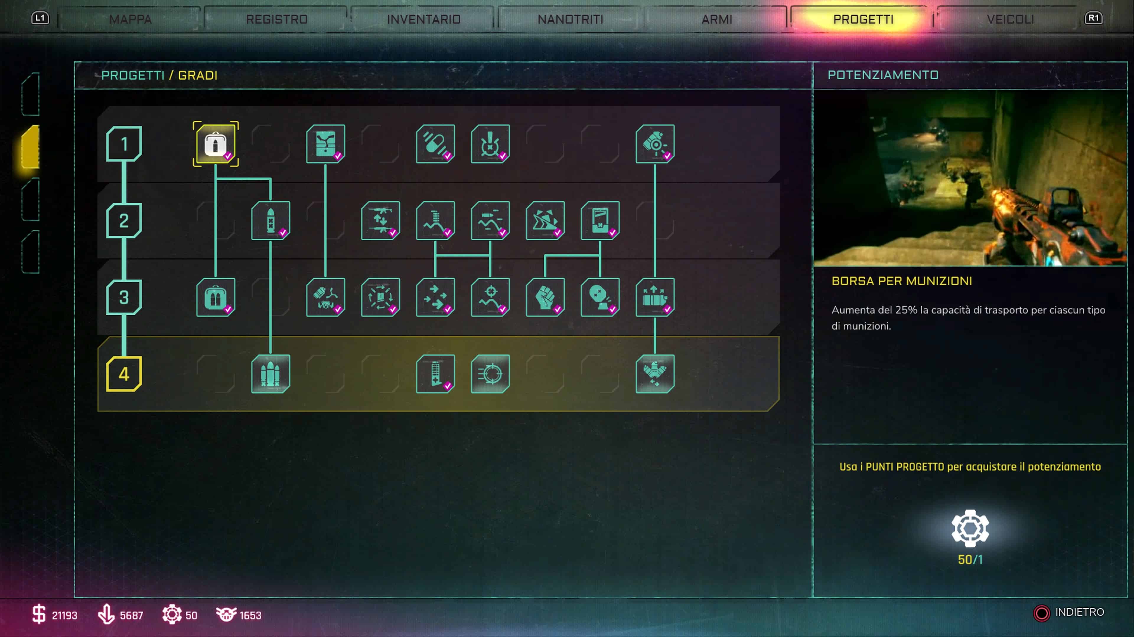 Infine troviamo i “progetti”. Anche i progetti sono essenzialmente abilità ma, a differenza delle precedenti, sono legate a diversi rami: “Uccidi e Distruggi”, “Conquista e Controlla” e “Cerca e Recupera”. Per sbloccare i progetti occorre utilizzare i “punti progetti”, ottenibili completando i vari luoghi disseminati nella Zona Devastata.