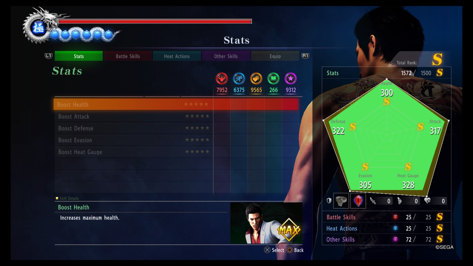 Al’interno del menù “Stats” troviamo i quattro rami di abilità sono Stats, Battle Skills, Heat Action e Other Skills. Le “Stats” sono le abilità base di Kiryu, come vita, aumento attacco, aumento difesa e così via. Mentre in “Battle Skills” possiamo apprendere più di 25 tecniche di combattimento, tra cui il “Parry”, i classici “Quickstep” e molto altro. Nella terza voce, “Heat Action”, troviamo tutte le tecniche utili per sferrare potentissime combo; in questo nuovo capitolo è infatti presente la nuova “Ultimate Hit Mode”, che dà la possibilità di sferrare le potentissime “Heat Actions”, letali attacchi utili per cambiare le sorti delle battaglie. Infine abbiamo l’ultima voce, “Other Skilles”, un ramo dedicato completamente alle abilità secondarie utili per completare alcune richieste secondarie o per aumentare la possibilità di droppare più Yen quando si picchia qualcuno.